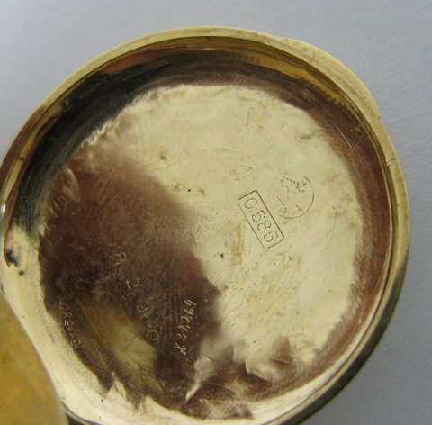 Lommeur af 14 kt guld med hvid emailleskive, romertal og minutindikation. Urkasse diameter 32 mm. Vægt 23,3 gr. Fremstillet af Charles Adolphe Juvet - La-Chaux-de-Fonds, Schweiz.