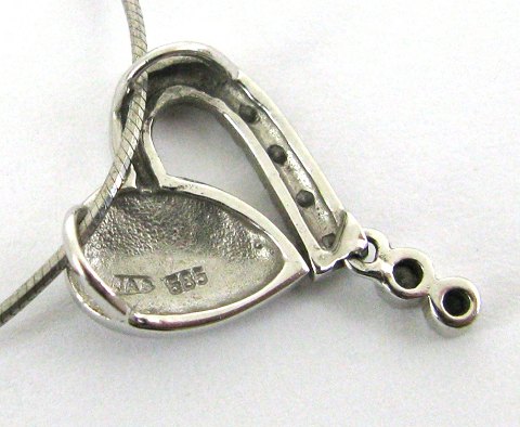 Halssmykke af 14 kt hvidguld med vedhæng i form af hjerte, prydet med 6 brillantslebne diamanter på samlet ca. 0,05 ct. Kæde L. 45,5 cm. Fremstillet hos guldsmed Jan Sørensen - Aalborg.
