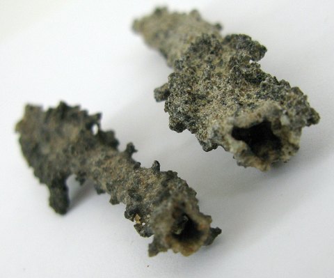 To rørformede fragmenter, dannet ved lynnedslag i ørkensand (Kvarts) ved nedsmeltning. Kan være flere tusind år gamle. L. 5 og 5,6 cm.
