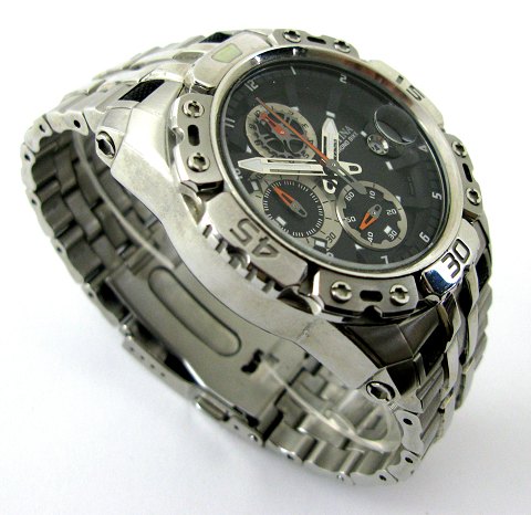 Festina chronograph herrearmbåndsur i urkasse og med lænke af stål. Sort skive med separat sekundviser, stregindikation, datovisning i #3 positionen med forstørrelsesboble, chronograph funktioner. Quartsværk. Urkasse diameter 46 mm.
