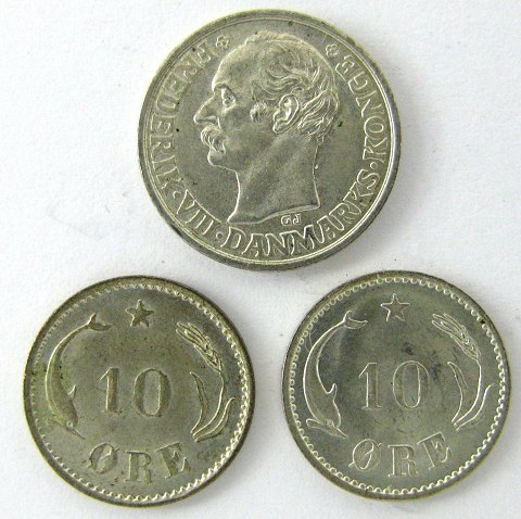 Christian VIII, 2x 10 øre sølv 1903 samt Frederik VIII, 25 øre sølv 1907