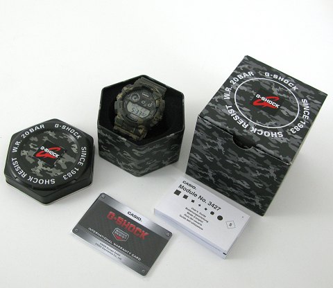 Casio G-Shock herrearmbåndsur i camouflage urkasse af kunststof/stål. 2-D skive med analog og digital tidvisning, sekundviser, tidszoner samt chronograph funktioner. Quartsværk. Urkasse diameter 48 mm. Rem af kunststof med metalspænde.