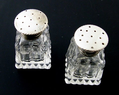 Salt og pebersæt med korpus af strukturslebet krystal og drysmanchet af sterling sølv, stemplet 925. H. 5 cm.