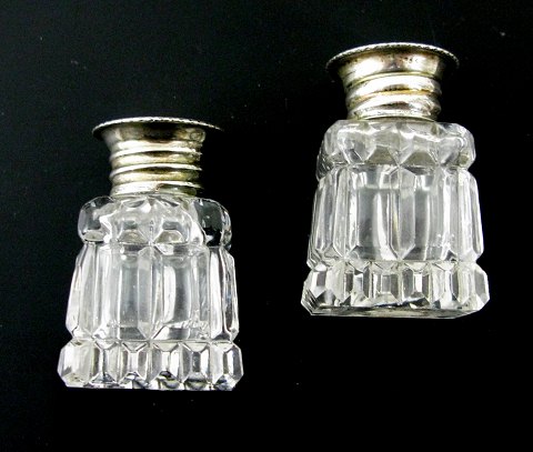 Salt og pebersæt med korpus af strukturslebet krystal og drysmanchet af sterling sølv, stemplet 925. H. 5 cm.