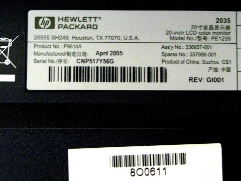 Hewlett-Packard, HP PE 1239 PC monitor serie CNP517Y56G
