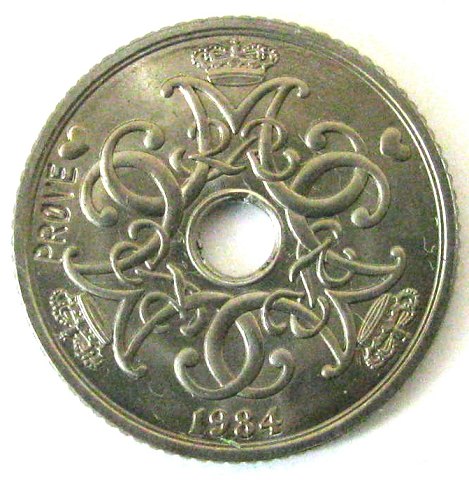 Sæt bestående af prøvemønt 20 kr, 10 kr, 5 kr, 2 kr, 1 kr, samt 50 øre og 25 øre 1984