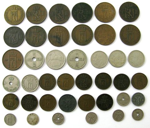 Lot bestående af 11x 2 øre 1889, -97, -99, 1902, -13, -14, -15, -33, -34, -35, -48. 13x 5 øre 1876, -78, -96, -99, 1902, -12, -14, -22, -28, -30, -31, -52, -58, 10 øre/3 sk 1874, 5x 10 øre: 1909, -27, -45, -58, -59. 2x 25 øre 1929, -43. 6x 50 øre 1929, -41, -54, -58, -59, -60. 3x 1 kr 1927, -47, -58.