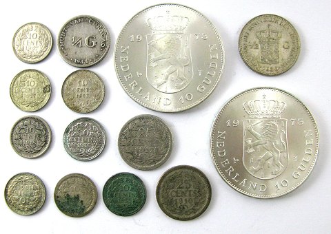 Lot bestående af Juliana, 2x 10 Gulden 1973, ½ Gulden 1930, Wilhelmina 1/4 Gulden 1944, 25 Cents 1910 og 1917, 8x 10 Cents 1863 - 1941