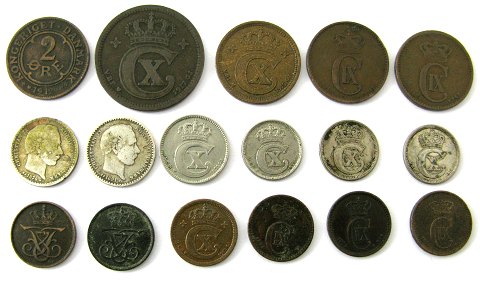 Chr. IX, Fr. VIII, Chr. X, 1, 2, 5, 10 og 25 øre