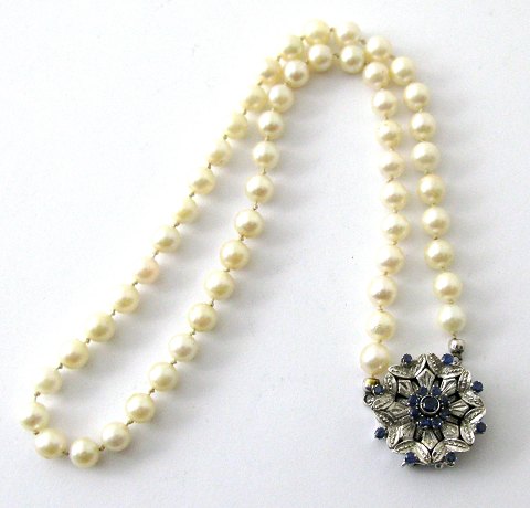 Collier med 6 mm. kvalitets kulturperler og stor flot rosetformet lukke af 18 kt. hvidguld, prydet med større blå og facetsleben safir, omkranset af 16 mindre facetslebne safirer. Kæde L. 43 cm.
