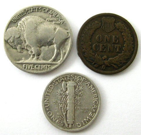 USA, 5 Cents 1936, Dime 1942 og One Cent 1903