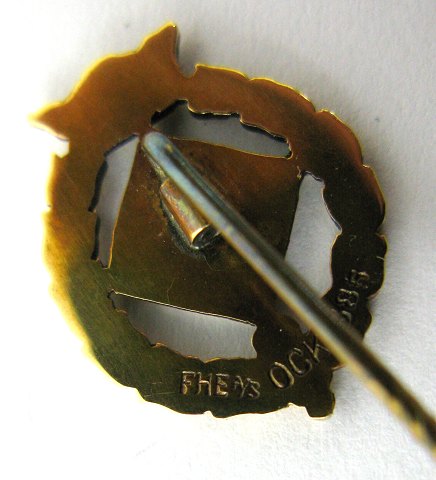 Frimurernål af 14 kt. guld i form af laurbærkrans under krone og AB monogram i rhombe. Tegn 15 x 19 mm. Fremstillet hos Fritz Heimbürger, København. Vægt, 2,4 gr.