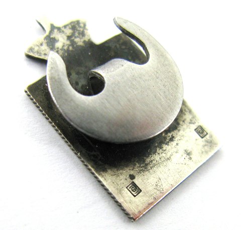 GJ knaphulstegn af sterlingsølv, prydet med rød emalje. Stemplet *GJ* for Georg Jensen samt "925".