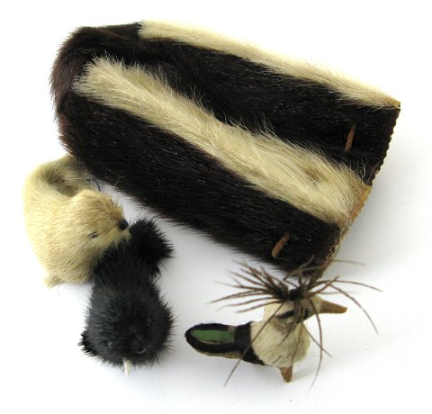 Grønlands pung af sælskind, L. 16 cm. samt sort og grå sæl af sælskind. Derudover medfølger asiatisk eller sydamerikansk fugl af skind, prydet med paradisfuglefjer.