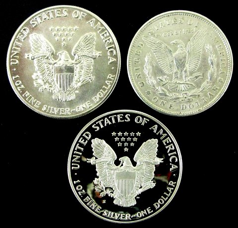 Lot bestående af 1 Dollar 1988S finsølv - 1 ounce proof, 1 Dollar 1987 1 ounce finsølv, begge *American Eagle* - KM 273 samt 1 dollar sølv 1921 *Morgan Dollar* - KM 110