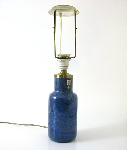 Cylindrisk lampefod, blæst af blærefyldt krystalglas i blå/lilla mixet farve. H. uden fatning og skærmholder 25 cm. Design Sidse Werner, Holmegaards Glasværk 1978