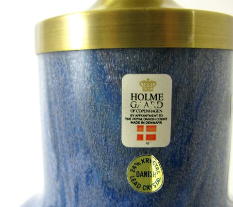 Cylindrisk lampefod, blæst af blærefyldt krystalglas i blå/lilla mixet farve. H. uden fatning og skærmholder 25 cm. Design Sidse Werner, Holmegaards Glasværk 1978