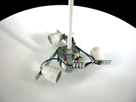 Loftlampen fremstår brugt med enkelte mindre skrammer i hovedskærmen og spotskærmen.
