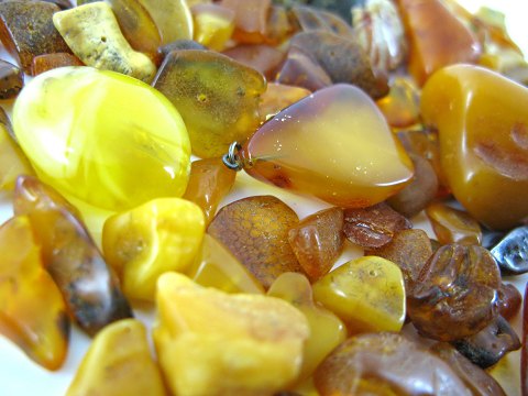 Den største ravklump måler ca. 45 x 35 mm., heriblandt er også enkelte ravvedhæng.
