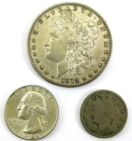 Lot bestående af One Dollar sølv 1879, Half Dollar sølv 1964 *Kennedy Memoriam møntsæt*, Quarter Dollar sølv 1964 samt V (5) Cents 1911