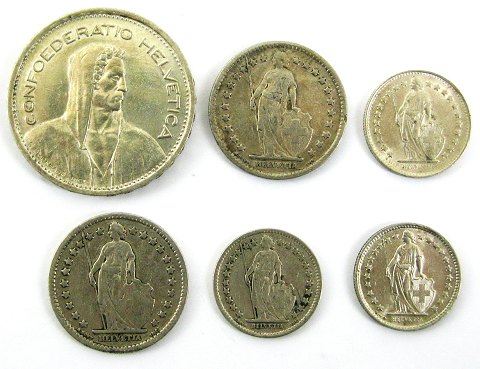 Schweiz, 5 Francs, 2x 1 Franc og 3x ½ Franc sølv (6)