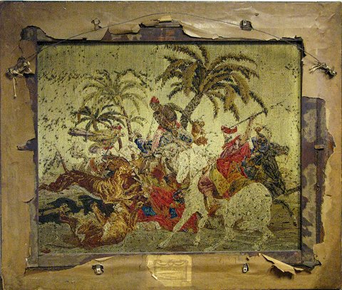Wool-work broderi i grove sting med et motiv fra en løvejagt i Nordafrika. Indrammet i egetræsramme med tidstypiske skæringer. Indrammet hos Maple & Co London omkring 1870. Blændmål 90 x 80 cm.