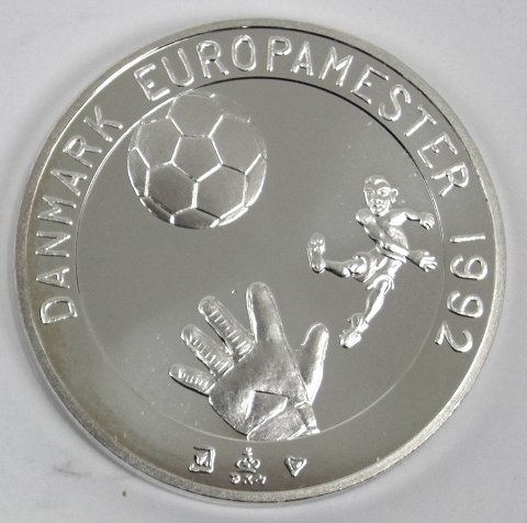 Medaille af finsølv, præget hos Den Kgl. Mønt i anledning af, at Danmark vinder Europamesterskabet i fodbold i 1992. Ø. 38 mm.