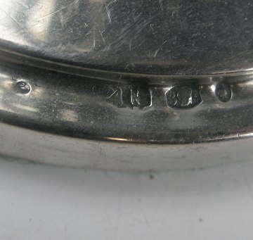 Par lysestager af sølv på rund fodstykke, herover profileret stamme. Udfyldte fodstykker. Stemplet med kvindehoved, flankeret med 3 og K. H. 21,5 cm. 20. årh.