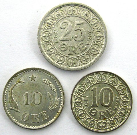 Danmark, 25 øre sølv 1907 samt 10 øre sølv 1903 og 1907 (3)