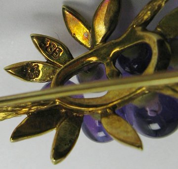 Flot kvalitetsbroche af 14 kt. guld i form af gren, prydet med 7 stk. perleslebne ametyster 4½ - 6½ mm., monteret på bladværk. L. ca. 7,5 cm.