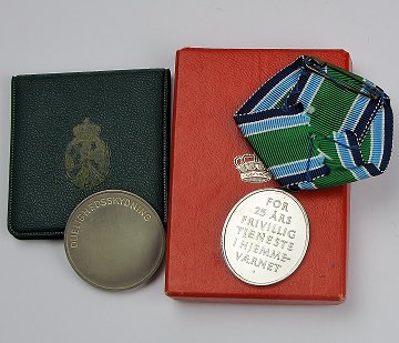 Hjemmeværnets 25-års tegn, indstiftet 1998, medfølges af originalt bånd samt ældre rødt etui fra M.W. Mørch & Søns Eftf. samt medaille for duelighedsskydning i grønt etui, Ø. 35,1 mm.