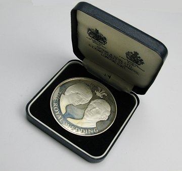 Medaille af sterlingsølv, præget í anledning af det royale bryllup mellem prins Charles og Lady Diana. Ø. 57,5 mm.