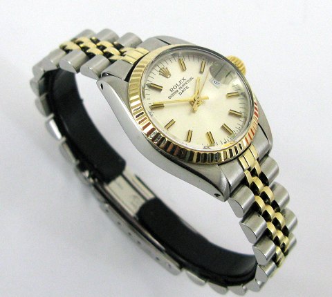 Rolex Date damearmbåndsur i urkasse og med Jubilee lænke af gud/stål. Lys metallic skive med stregindikation, central sekundviser og datovisning ved #3 positionen. Automatisk værk. Urkasse diameter 26 mm.
