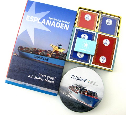 Lot bestående af litteratur og gaveartikler fra A.P.Møller Mærsk i form af bogen 'Esplanaden* - Årets gang i A. P. Møller-Mærsk, ubrugt gammelt spil kort i flot æske med rederiets logo, æske tændstikker og Triple-E kagedåse. Sidstnævnte dog uden Kjeldsens cookie!