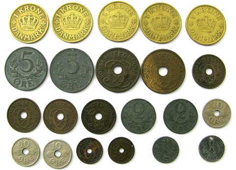 Christian X, 1 øre, 2 øre, 5 øre, 10 øre og 1 kr (22)