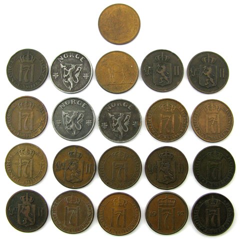 Norge, samling 5 øre - bedre årstal imellem. 1876, -78, -96, -99, 1902, 1908, -11, -13, -22, -29, -30, -31, -35, -37, -39, -42, -43, -44, -52, -58, -65. (21)