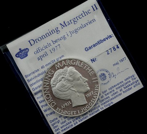 Limiteret fremstillet medaille af sterling sølv, præget i anledning af Dronning Margrethe II officielt besøg i Jugoslavien, april 1977. Diameter 40 mm., finsølvindhold 22,2 gr. Medaille nr. 2784 / 5000