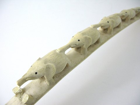 Stødtand fra afrikansk elefant med skæringer i form af elefanter på række, ved roden afsluttet med to krokodiller.