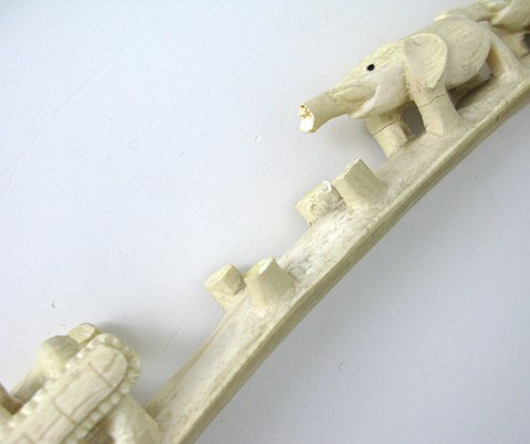 Stødtand fra afrikansk elefant med skæringer i form af elefanter på række, ved roden afsluttet med to krokodiller.