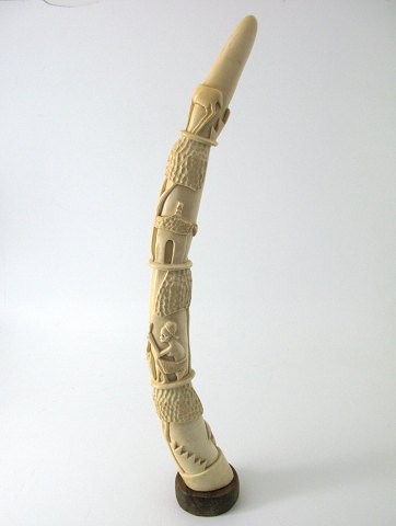 Stødtand fra afrikansk elefant på fodstykke af mahogny. Skæringer i form af figurer, hytte og antilope, ved roden afsluttet med mahognystand.