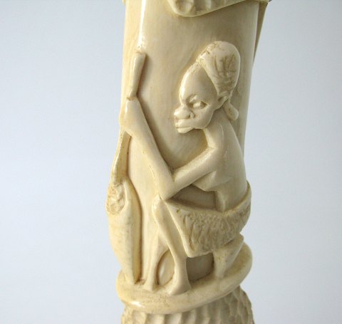 Stødtand fra afrikansk elefant på fodstykke af mahogny. Skæringer i form af figurer, hytte og antilope, ved roden afsluttet med mahognystand.
