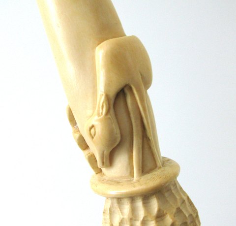 Stødtand fra afrikansk elefant på fodstykke af mahogny. Skæringer i form af figurer, hytte og antilope, ved roden afsluttet med mahognystand.