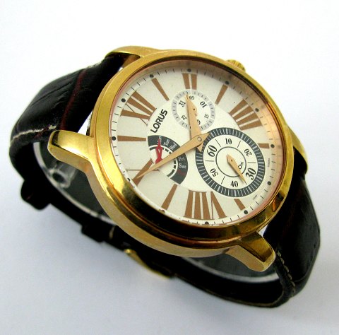 Lorus herrearmbåndsur i urkasse af forgyldt stål med metallic grå skive med romertal, separat sekund, dato og ugedag visning. Quartsværk. Urkasse diameter 42 mm.