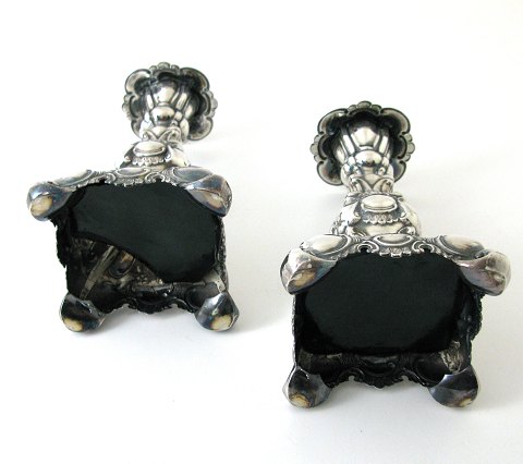 Par udfyldte, svenske stager af sølv i barokform, drevet med bukler og volutter samt blomsterranker. Stemplet GAB med tre kroner samt Z8 for fremstillingsåret 1950.