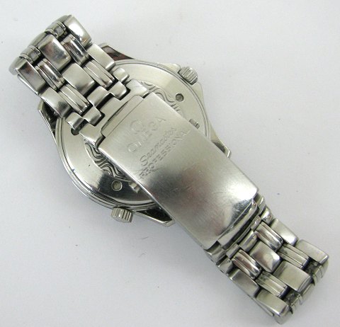 Omega herrearmbåndsur, model Seamaster Professional 300 M, ref.nr.: 25418000, med kasse og lænke af stål, sort, bølgestruktureret urskive med fluorescerende punktinddeling, sekundviser, datoangivelse ved 3" position, marineblå lynette med arabertal, safirglas, quartzværk, vandtæt til 300 m. Urkasse diameter 41 mm.