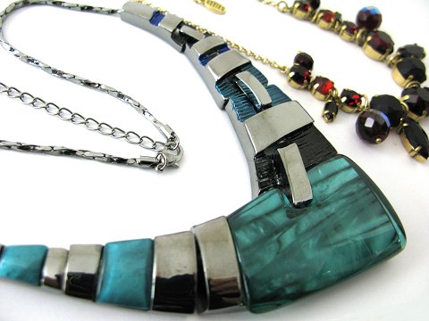 Pilgrim halssmykke med turkisfarvede kunstsegmenter med tilhørende orestkker, samt halssmykke med granatfarvede sten, begge med justerbar længde.