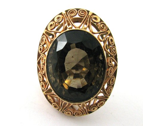 Enorm ring af 14 kt. guld, håndfremstillet med oval gennembrudt filigranmønstret front, prydet med stor facetsleben røgkvarts på 25 x 20 mm. Ringfront 40 x 30 mm. Stemplet SP og polske guldstempler. Ring Str. 56, samlet vægt 25,5 gr., 20. årh.