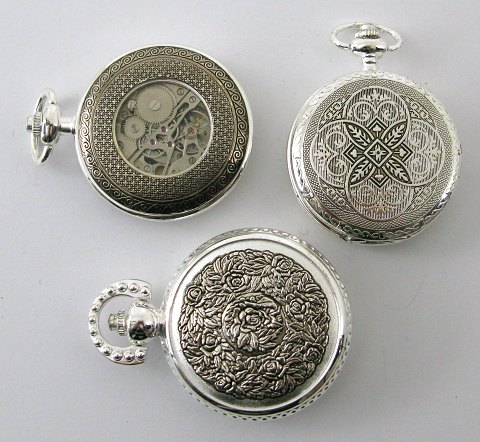 3 lommeure i forsølvet urkasse af dekoreret metal, model Saint-Denis, Gentry og Sorge. Alle med fungerende, mekanisk optræksværk. Urkasse diameter ca. 50 mm.
