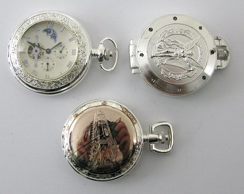 3 lommeure i forsølvet urkasse af dekoreret metal, model Esprit du Temps, Olympia og Carlston. Alle med fungerende, mekanisk optræksværk. Urkasse diameter ca. 50 mm.