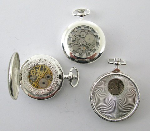 3 lommeure i forsølvet urkasse af dekoreret metal, model Horloger, Boston og Nantes. Alle med fungerende, mekanisk optræksværk. Urkasse diameter ca. 50 mm.